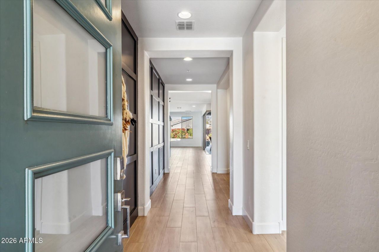 Welcome to this exceptional, 2-bedroom, 2-bath luxury home in Trilogy. Thoughtfully designed with high-end finishes and smart upgrades, this home seamlessly blends style, comfort, and functionality. The gourmet Monogram kitchen showcases white shaker cabinets, quartz countertops, and a natural stone backsplash, complemented by recessed and pendant lighting. The great room and den open to a private backyard oasis through duel, disappearing, sliding glass doors, extending the indoor-outdoor living experience. The custom patio fireplace and the custom water feature create an enjoyable outdoor experience with exceptional MOUNTAIN VIEWS. The spacious primary suite features blackout shades and stunning mountain views, while the spa-like bath boasts custom counter tops, duel vanities and a floor-to-ceiling, glass enclosed tiled shower. Tile flooring flows throughout, enhancing the homes modern aesthetic.Quality craftsmanship is evident in the 8-foot solid core doors with brushed nickel hardware and the recently painted walls, highlighted by an elegant feature wall at the entrance. The oversized garage includes a 4-foot extension, epoxy flooring, a side entry, and exterior storage. Smart home features include an advanced water filtration system.Ideally located within Trilogy at Verde River, this fully fenced home offers privacy while being surrounded by breathtaking natural landscapes and world-class amenities.