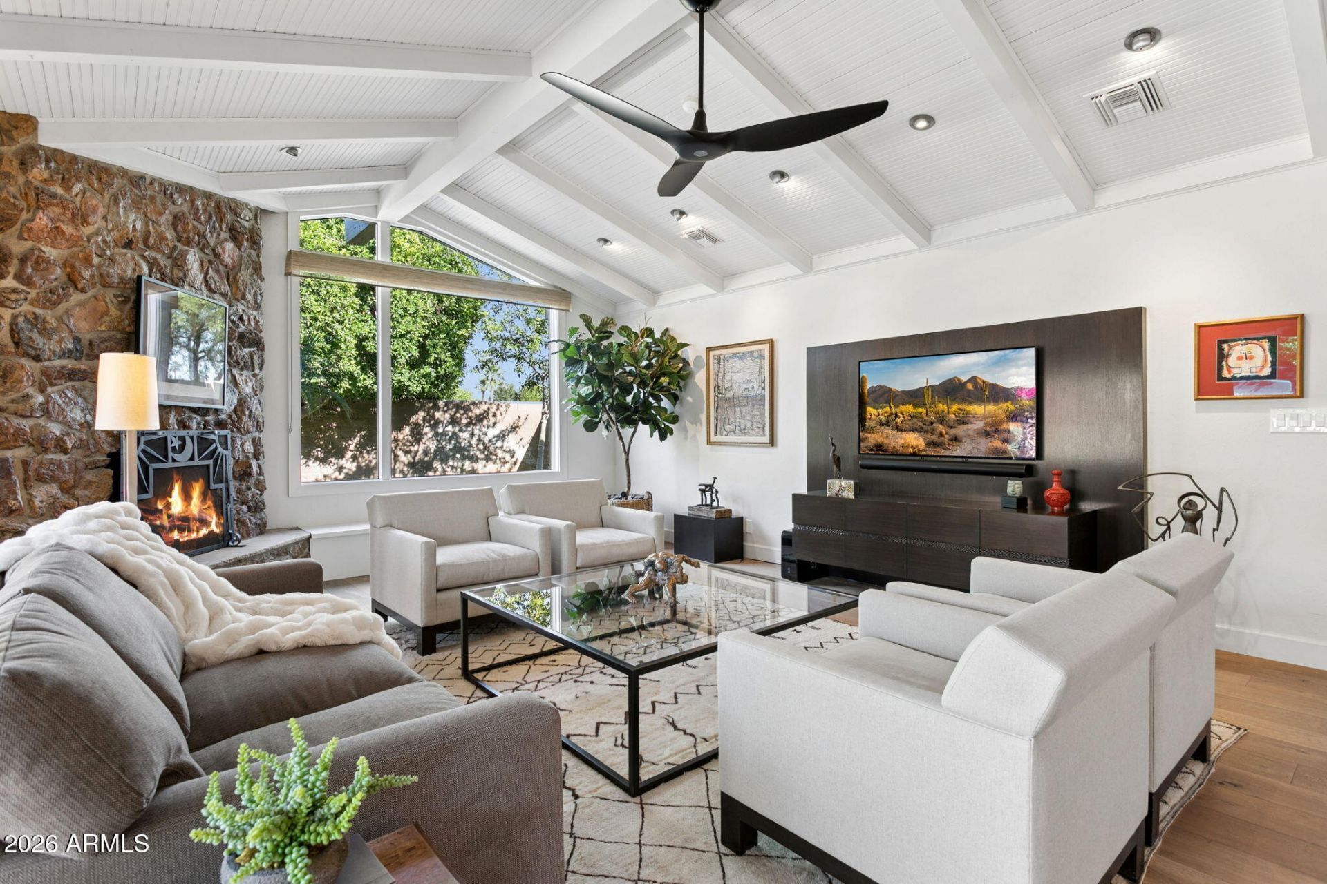 Redesigned mid-century craftsmanship in the heart of the Biltmore. Captivating at first sight, the striking curb appeal showcases rusted metal accents, ledger stone, and stained wood elements that create a timeless architectural statement. Thoughtfully enhanced over the years, this 3,296 sf residence offers 4 bedrooms, a dedicated den, and 3 baths, all situated on an expansive 14,527 sqft lot. Inside, the home blends warmth and sophistication with French oak wood flooring, beadboard ceiling accents, and timeless wood burning stone fireplace. The main living area is filled with natural light from expansive windows, creating a seamless connection between indoor and outdoor living. The spacious kitchen is designed for both everyday living and entertaining, featuring a large island with.... with granite countertops, abundant cabinetry, and premium Miele and KitchenAid appliances. A charming breakfast nook opens to the living area, while a formal dining room with a custom built-in adds an elevated touch for hosting.Additional living spaces include a generous family room and a dedicated den, offering flexibility for a home office, media lounge, or private retreat. The primary suite is a spacious peaceful sanctuary with abundance of storage and direct backyard access with pool views. The ensuite bath is generously appointed with dual vanities, a centrally positioned soaking tub, and a beautifully tiled shower.Designed for AZ Living & Lifestyle the outdoor is a true sanctuary. An extended covered patio with a tongue-and-groove ceiling, recessed lighted column details, and custom metal gates add privacy and design continuity. Stamped flagstone hardscaping defines multiple areas for lounging and entertaining, all centered around a private pool with a separate tranquil waterfall feature that enhances both ambiance and visual appeal.This residence offers a lifestyle defined by walkability, convenience, and premier amenities. Foodies will enjoy being surrounded by some of Phoenixs most sought-after dining destinations FLINT by Baltaire, Chelseas Kitchen, The Collins Small Batch Kitchen, North Italia and Buck & Rider to name a few hot spots. Enjoy easy access to the iconic Arizona Biltmore Golf Club and Arizona Biltmore, A Waldorf Astoria Resort, along with nearby Biltmore Fashion Park and Lifetime Biltmore. Convenient access to Sky Harbor, Downtown Phoenix, Old Town Scottsdale, and Tempe, bringing the very best of the Valley right to your doorstep.