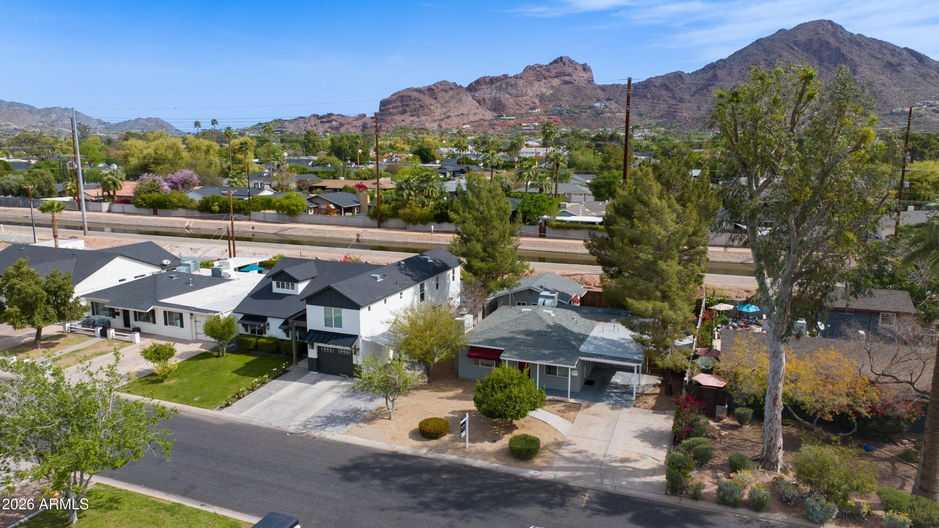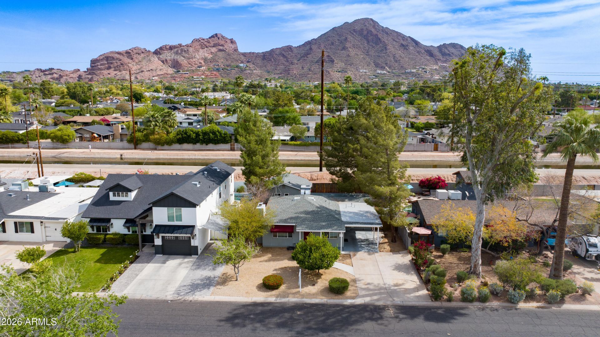 Located in the heart of highly sought-after Arcadia, this charming cottage offers the perfect blend of timeless character and modern upgrades. The main home was fully remodeled in 2011 and features solid block construction, a cozy gas fireplace, and stylish hard-surface flooring throughout -- creating a warm, low-maintenance living space thats truly move-in ready. Adding exceptional versatility, the property also includes a spacious 1-bedroom ADU built in 2021 with wood-frame construction -- ideal for guests, a private office, rental income, or multigenerational living. The setting is what truly makes this property special. Positioned in coveted Arcadia Proper, the home offers stunning front-and-center views of Camelback Mountain and direct access to the scenic Arizona Canal, perfect for biking, walking, or evening strolls. Step outside to a large backyard shaded by mature trees -- a peaceful retreat with plenty of space to relax, entertain, or expand. Opportunities like this are rare: a remodeled Arcadia cottage, a newer guest house, mountain views, and canal access all in one of Phoenixs most desirable neighborhoods.