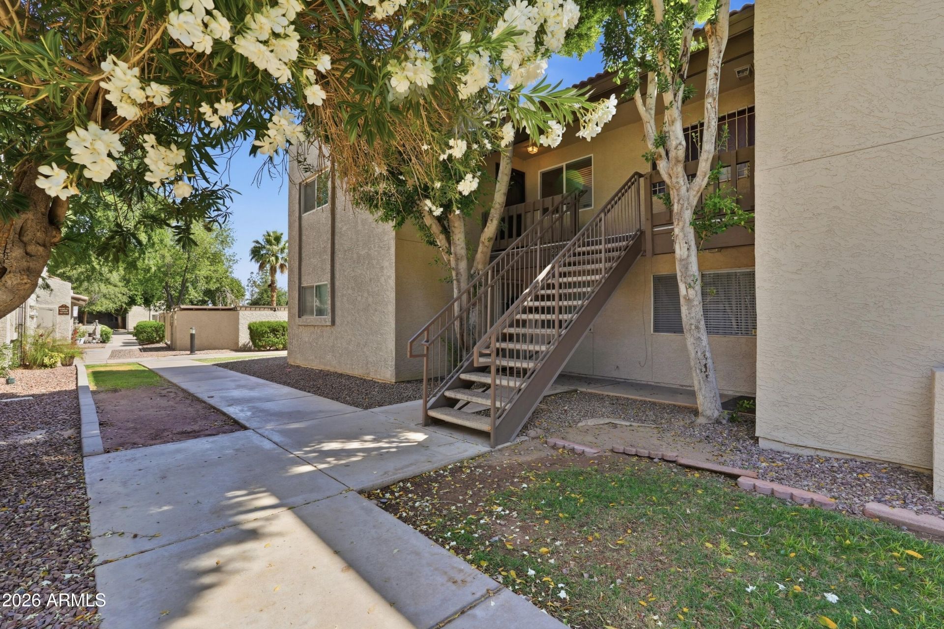 FHA approved! Premium upper-end unit with direct pool views from your private balcony, just steps away. Light-filled interior with an open layout and split floor plan, featuring wood-look flooring, updated dual pane windows and patio door, neutral tones, recessed lighting, and ceiling fans. The living area opens seamlessly to the balcony, creating ideal indoor/outdoor flow. Kitchen offers granite countertops, breakfast bar, ample cabinetry, and newer stainless steel appliances. Both the primary suite and split second bedroom feature walk-in closets. Newer stacked washer/dryer and refrigerator convey. Located near Mesa Community College, ASU, spring training facilities, shopping, dining, and entertainment. Low-maintenance living in a prime location!
