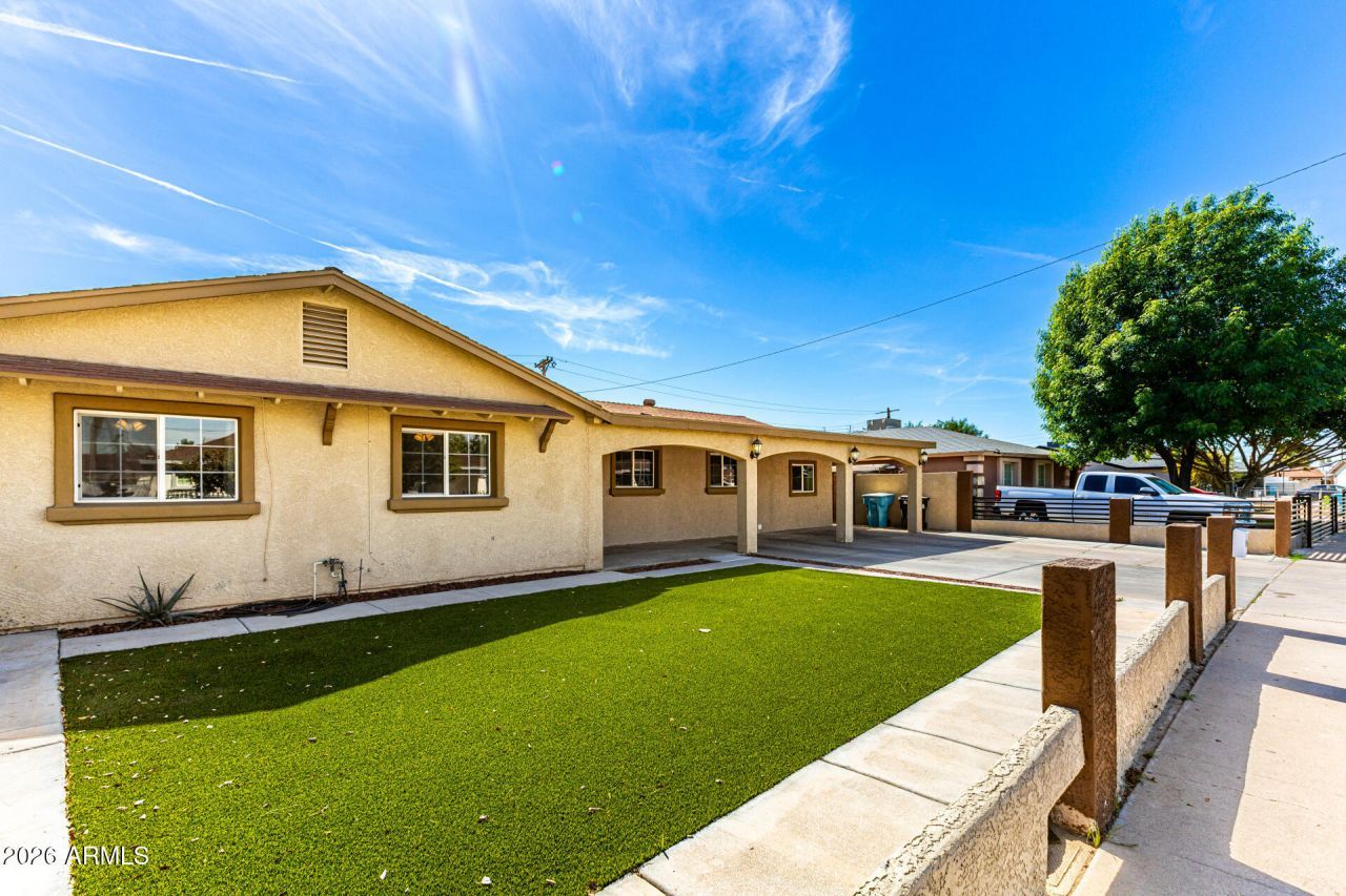 Dont miss this charming, spacious single-level home in Phoenix! Displaying a large front yard with a front porch, driveway parking, and a synthetic lawn. The inviting interior showcases tons of natural light, a designer palette, and soft carpet & wood-look tile flooring throughout. Youll love the semi-open layout, which perfectly balances privacy & connectivity! French doors merge the inside & outside activities. The impressive kitchen boasts SS appliances, quartz counters, gray shaker cabinetry, recessed lighting, and an island w/breakfast bar. The main bedroom has a private bathroom for added comfort. Enjoy relaxing or gatherings in the sizable backyard! A covered patio, artificial turf, lush lawn, built-in BBQ, Ramada, storage shed, & RV gate complete the picture. Make this gem yours!