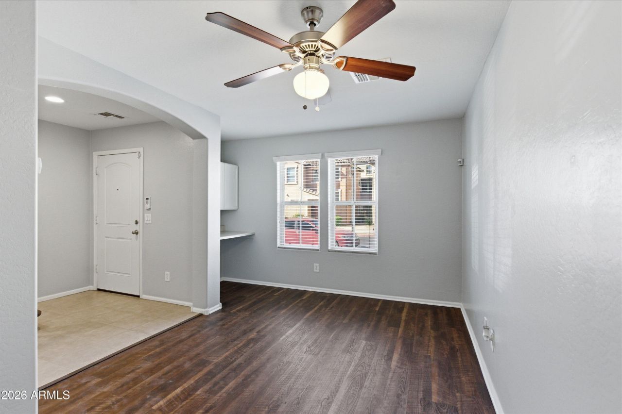 Welcome to a stylish 2013-built tri-level home offering modern living, flexible space, and exceptional value, strategically priced while delivering the square footage and functionality of many 3-bedroom homes.The versatile ground-floor flex space works perfectly as a third bedroom, guest suite, home office, or creative studio, ideal for todays work-from-home lifestyle. Upstairs, the main living area features a bright open-concept layout with a beautifully designed chefs kitchen, complete with stainless steel appliances, an expansive island, and a custom pantry, perfect for entertaining or everyday living.The top floor features dual primary suites, each with private en-suite bathrooms, creating an ideal setup for roommates, guests, or a comfortable primary retreat. Modern touches throughout include luxury vinyl plank flooring, coordinated ceiling fans, and an organized laundry space for both style and convenience.Residents enjoy resort-style community amenities including two sparkling pools, a splash pad, and basketball courts, providing fun and relaxation right outside your door.The location offers easy access to some of the Valleys best attractions. Youre just minutes from Westgate Entertainment District, home to dining, shopping, and nightlife, as well as State Farm Stadium, where major concerts and sporting events take place. Outdoor enthusiasts will also appreciate nearby Desert West Park for green space, trails, and recreation.Conveniently located about 15 minutes from downtown Phoenix, this home offers quick access to work, entertainment, and major freeways, making commuting simple while still enjoying a quiet neighborhood setting.