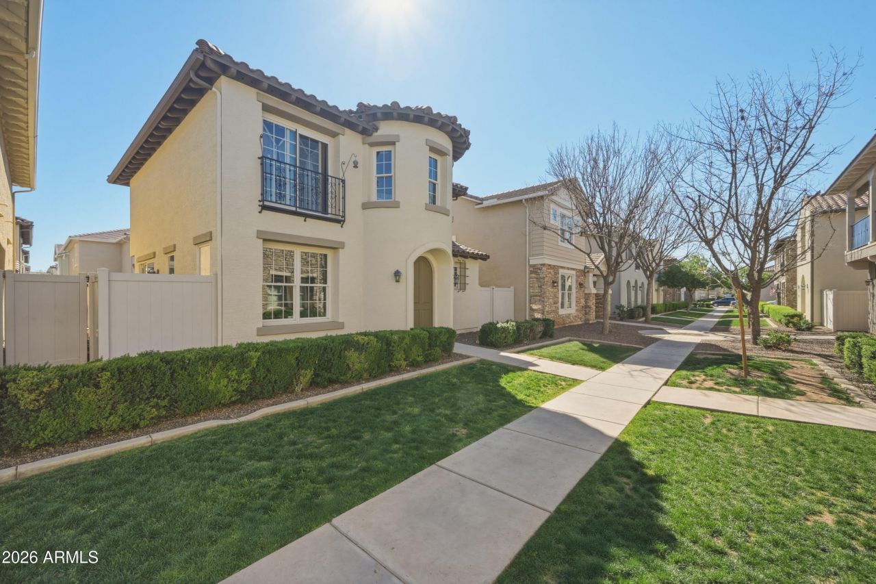 Tuscan-inspired charm meets modern comfort in this beautifully updated home with a striking turret and inviting curb appeal. Wood plank tile flows through a spacious great room that opens to the dining area and covered patio. The large kitchen offers granite countertops, breakfast bar, stainless steel appliances (including new dishwasher), new faucet, and ample cabinetry with upper and lower lighting. Upstairs features a versatile loft and a generous owners suite with turret sitting area, separate tub/shower, and dual sinks, plus convenient second-floor laundry. Enjoy walking access to 3 community pools with spas, 2 playgrounds, greenbelts, shopping, restaurants, and the Gilbert Library. A nice blend of style, convenience, and community living--ready for you to move in and enjoy! Recent upgrades include tankless water heater, new fans in every room, LED throughout, water-saving fill valves, and exterior paint (April 2025).