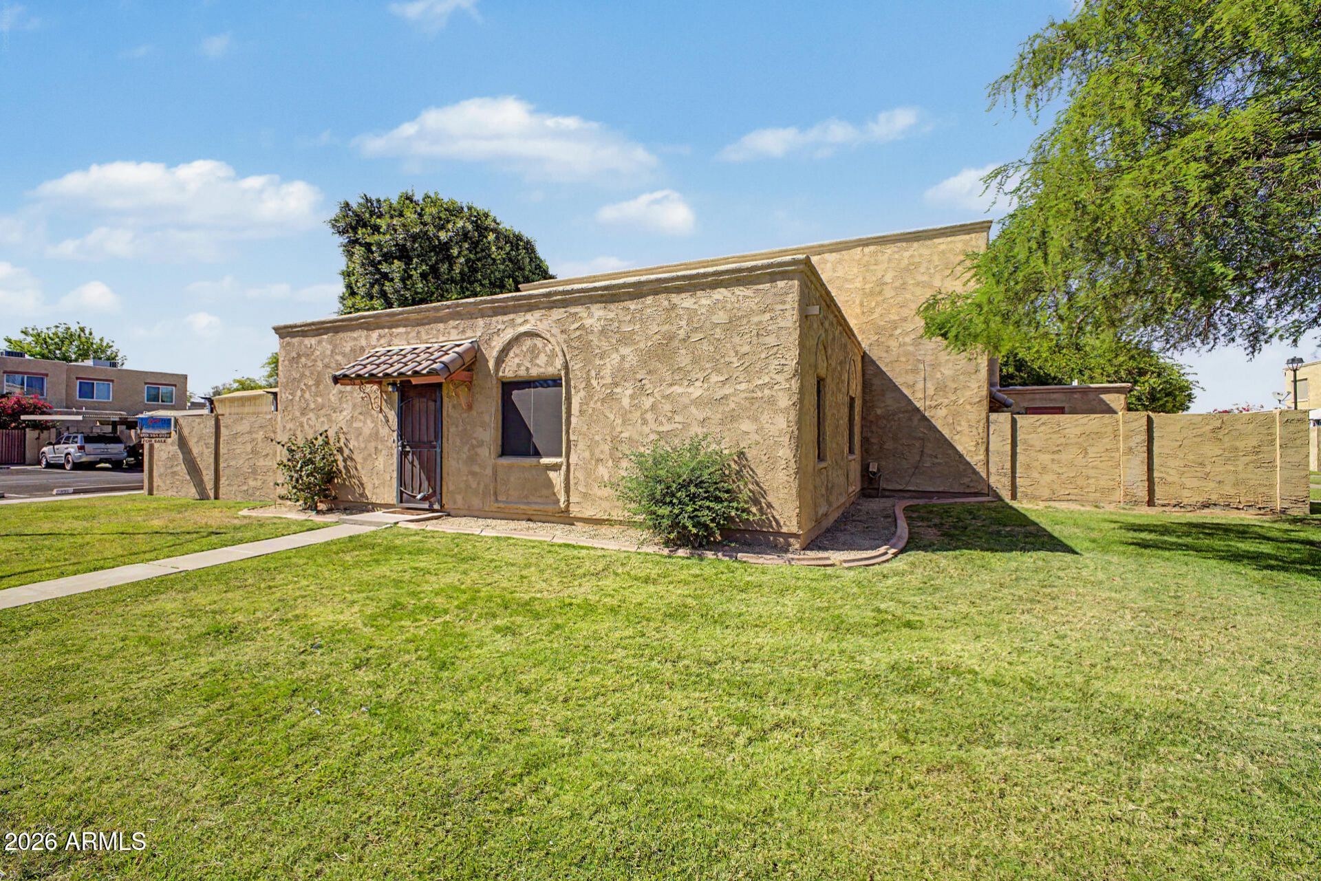 Charming end unit townhome in Hallcraft Villas Mesa, ready to move in! The inviting interior showcases a neutral palette, tons of natural light, and tile flooring throughout. The welcoming living space is paired with sliding doors to the patio. The eat-in kitchen boasts built-in appliances, a pantry, and white shaker cabinetry. With 2 beds and 1 bath, this home is great for anyone looking to enjoy easy and low-maintenance living. If you want to relax or have a fun gathering, the private yard with a patio is waiting for you! The attached storage unit is an added perk. Lets not forget the assigned parking space for your convenience. Enjoy the nearby Community pool for year-round fun! Close to schools, shopping, dining options, parks, and easy access to freeways. Dont miss this opportunity!
